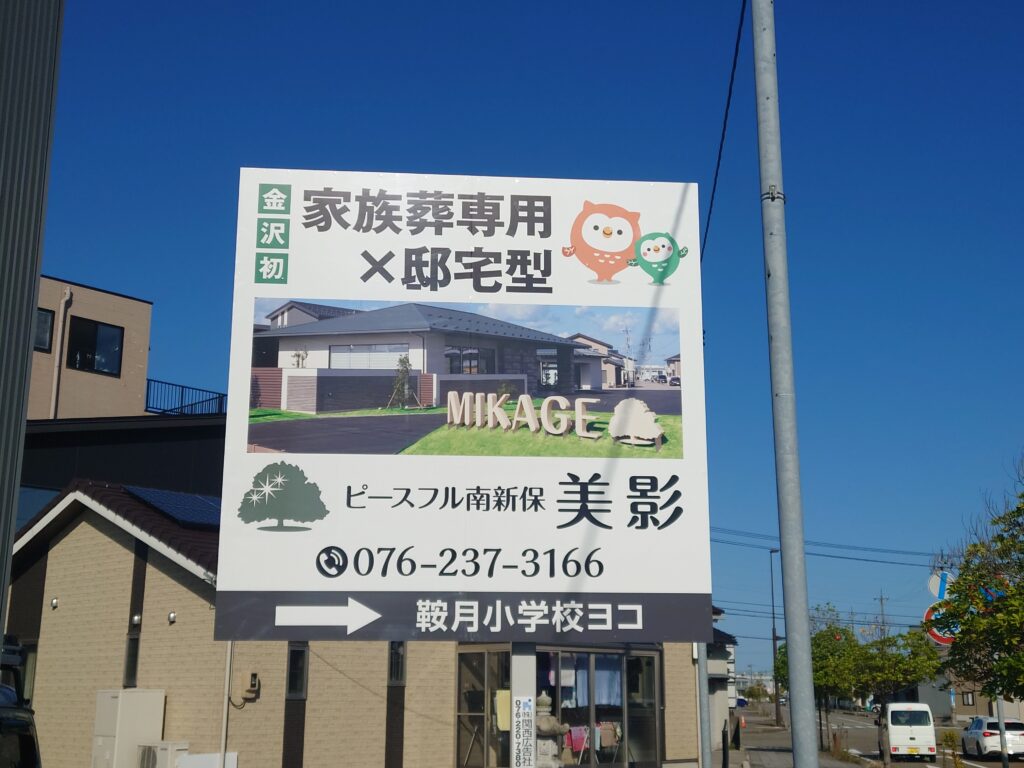 看板には当会館の名称とロゴを大きく配置し、