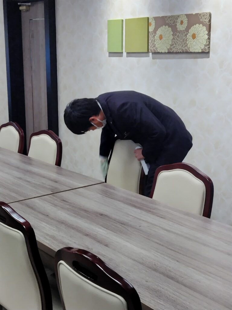 写真は、そうした取り組みの一場面を切り取ったものです。消毒用クロスで丁寧にイスを磨く瞬間——特別な演出ではなく、私たちの日常そのものです。清潔であること、整っていること、そしてなにより“心を込めて整える”ことが、私たちの仕事の原点だと考えています。