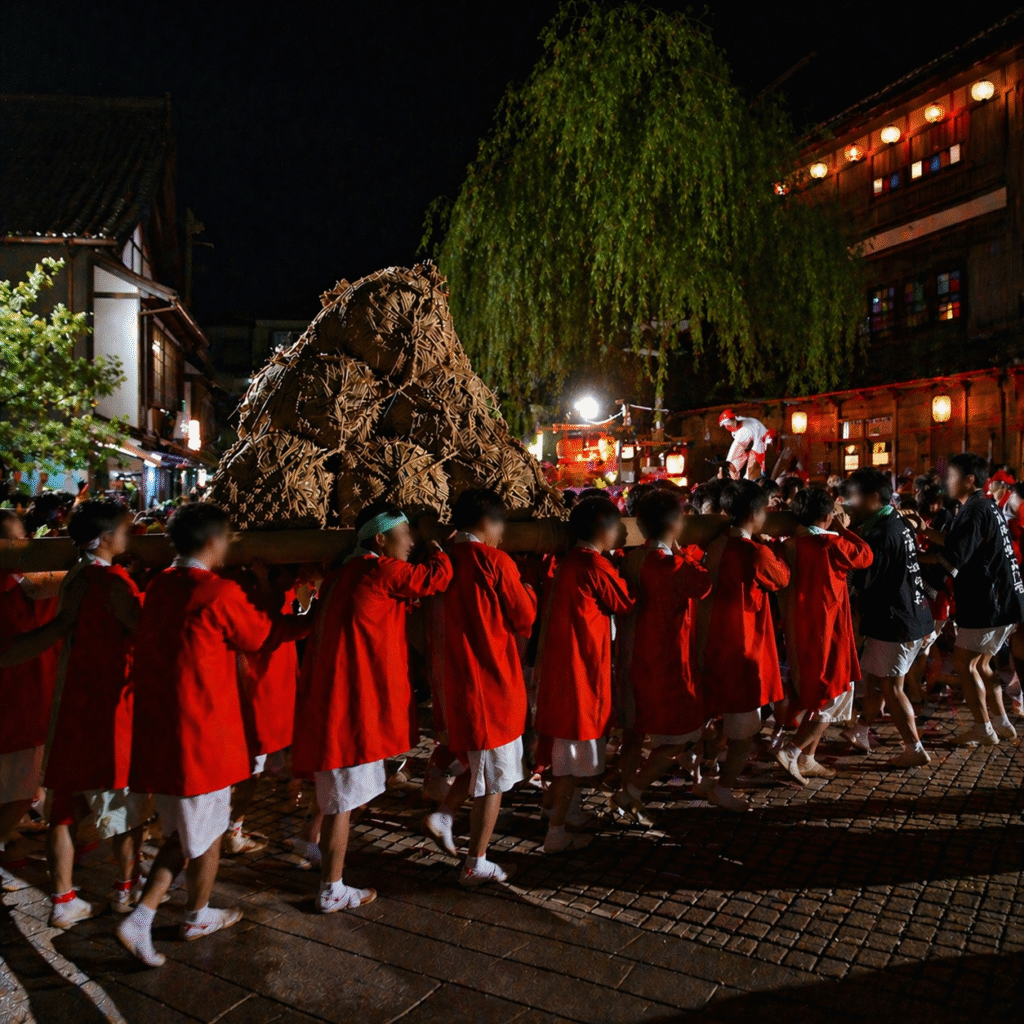 30mの引網をつけた「台棒」の上に菖蒲の俵を6俵、下に2俵、一番上の俵には「菖蒲と蓬」を1束くくりつけ350kgにもなる神輿が引き回されます。引き回され、俵から散乱した菖蒲を奪い合い山代温泉の総湯に投げ入れます。一番の入浴者は、その年の災厄から逃れられると言われています